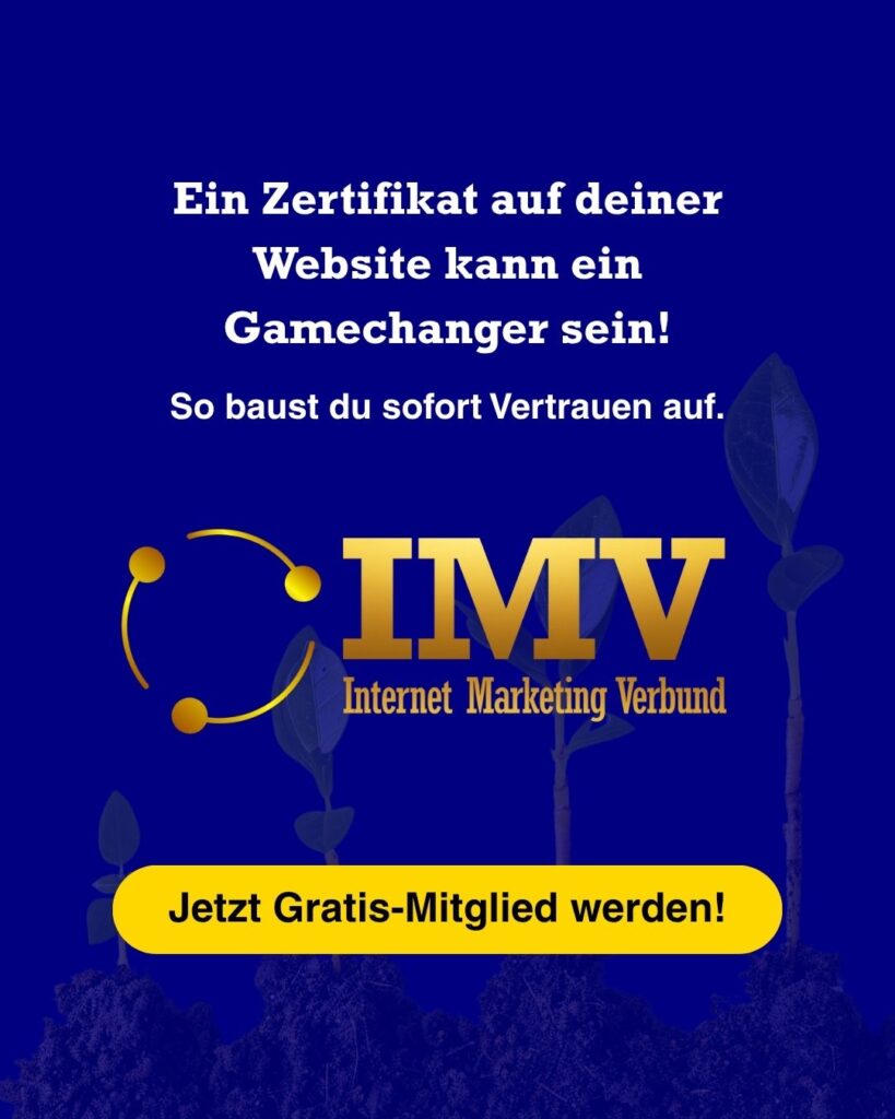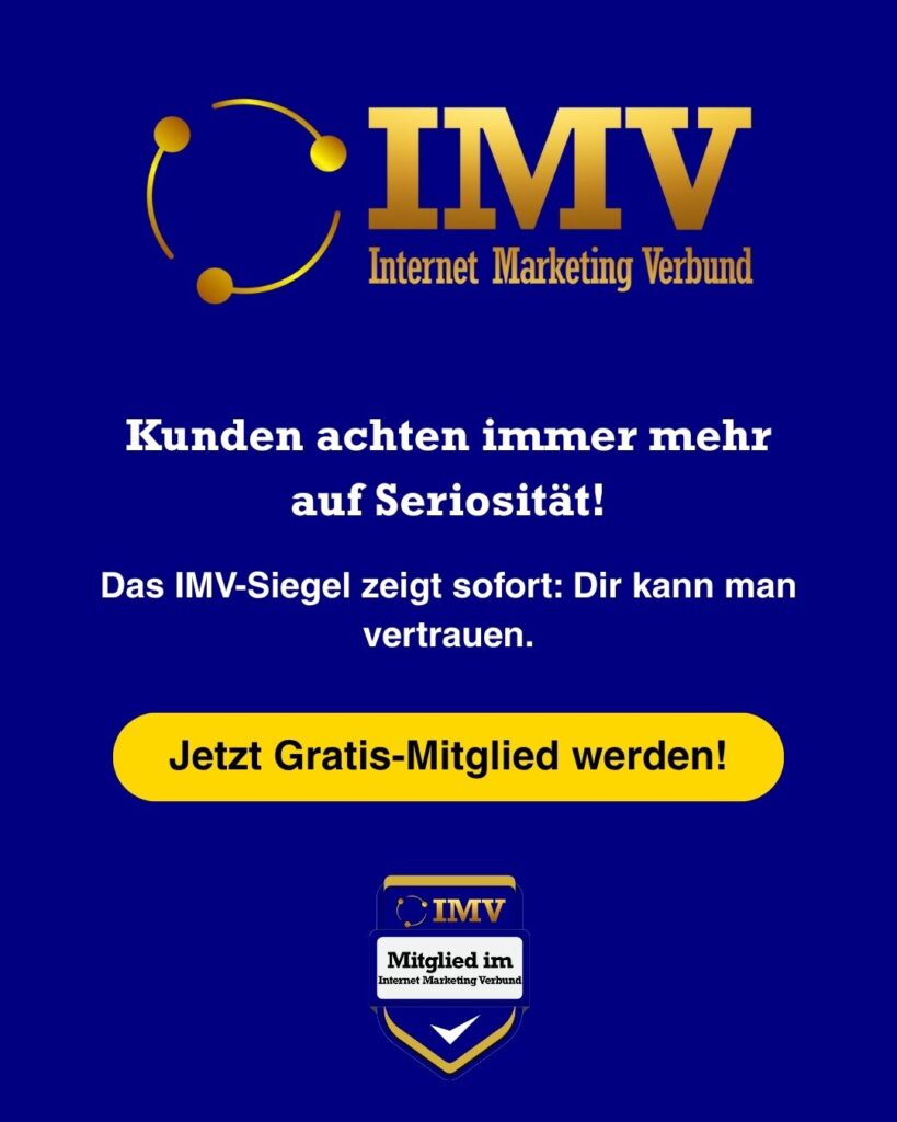 Seriosität zeigenMenschen vertrauen nur, wenn sie sich sicher fühlen. Zeig, dass du seriös bist – mit dem IMV-Siegel.→ Jetzt starten.