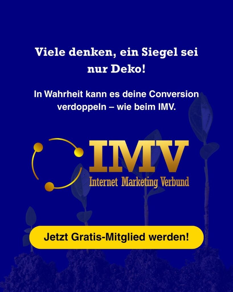 Siegel = Conversion-BoosterEin Siegel ist kein Deko-Element. Es ist ein Verkaufs-Booster. Das IMV-Siegel schafft Vertrauen – und mehr Umsatz.→ Hol’s